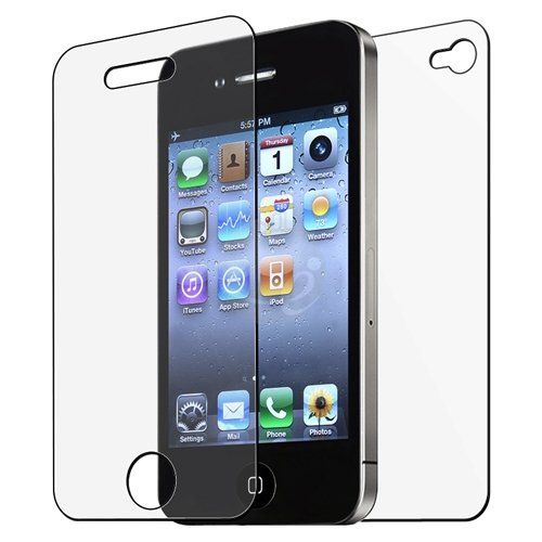 - Package includes 2 screen protectors cover the whole front and back side of iPhone 4. Offers tough, durable, transparent surface while keeping the LCD screen clean and unscratched. Anti-glare surface reduces the glare when viewing the screen under strong light sources. Attaches smoothly with self-adhering surface. Leaves no residue when removed.